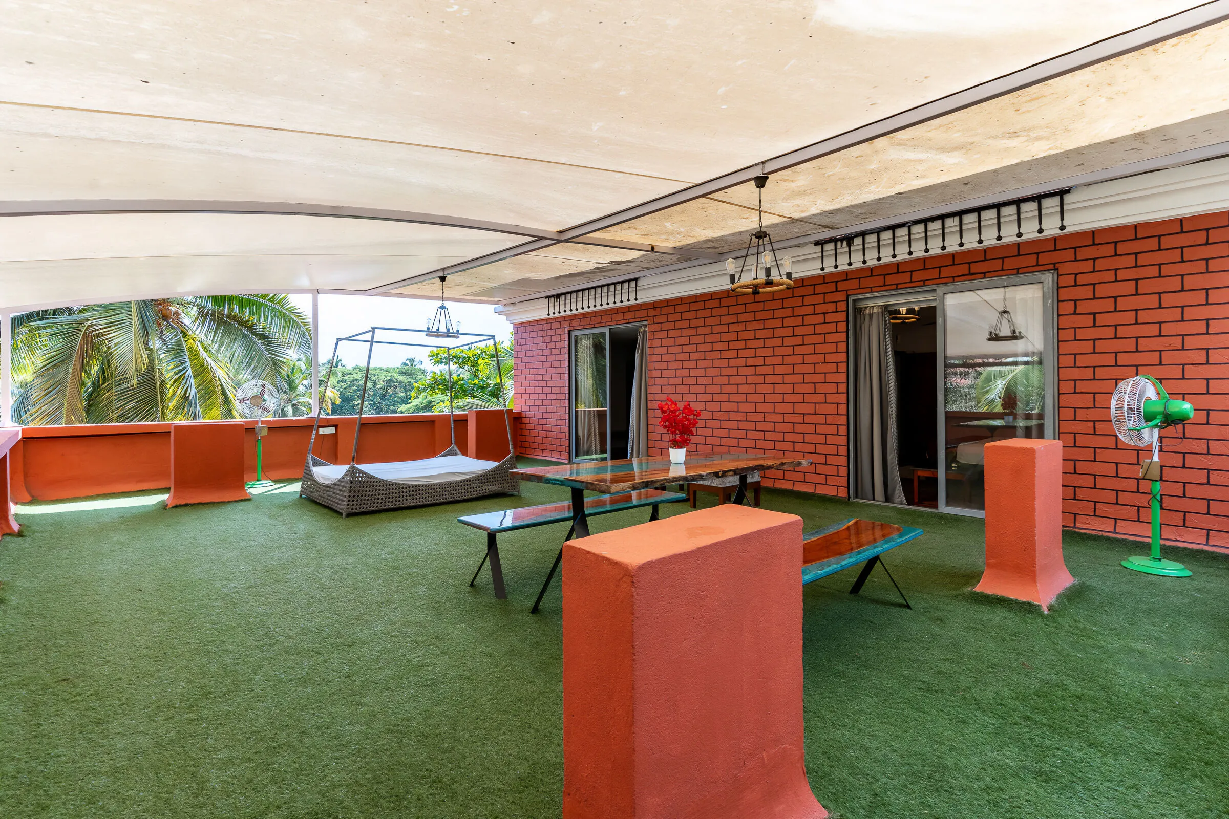 The Master Suite is Zense Resort's most luxurious accommodation, offering a massive 1000 sq. ft. private terrace for outdoor lounging and dining. The suite features a king-size bed, a single bed, two attached bathrooms, and premium amenities — making it ideal for families and groups.